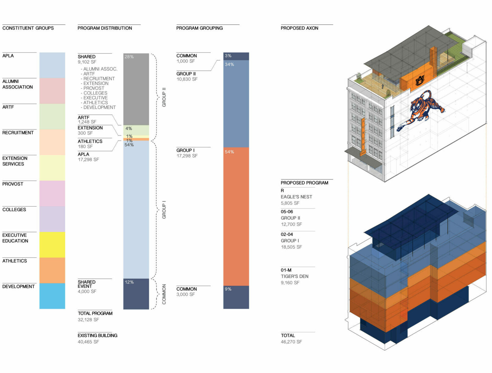 Our office managed the preliminary programming effort as well as documenting the existing conditions in order to investigate the potential configurations and use groupings as options for the clients review and input. Auburn’s School of Architecture’s Urban Studio will be based in the building, in addition to space for members of the Alumni Association, Executive Education, Athletics, Provost’s Office and the Development team. Critically important was the ability for the building to engage with the City and regional community as well as become a landmark for Auburn University in Birmingham.