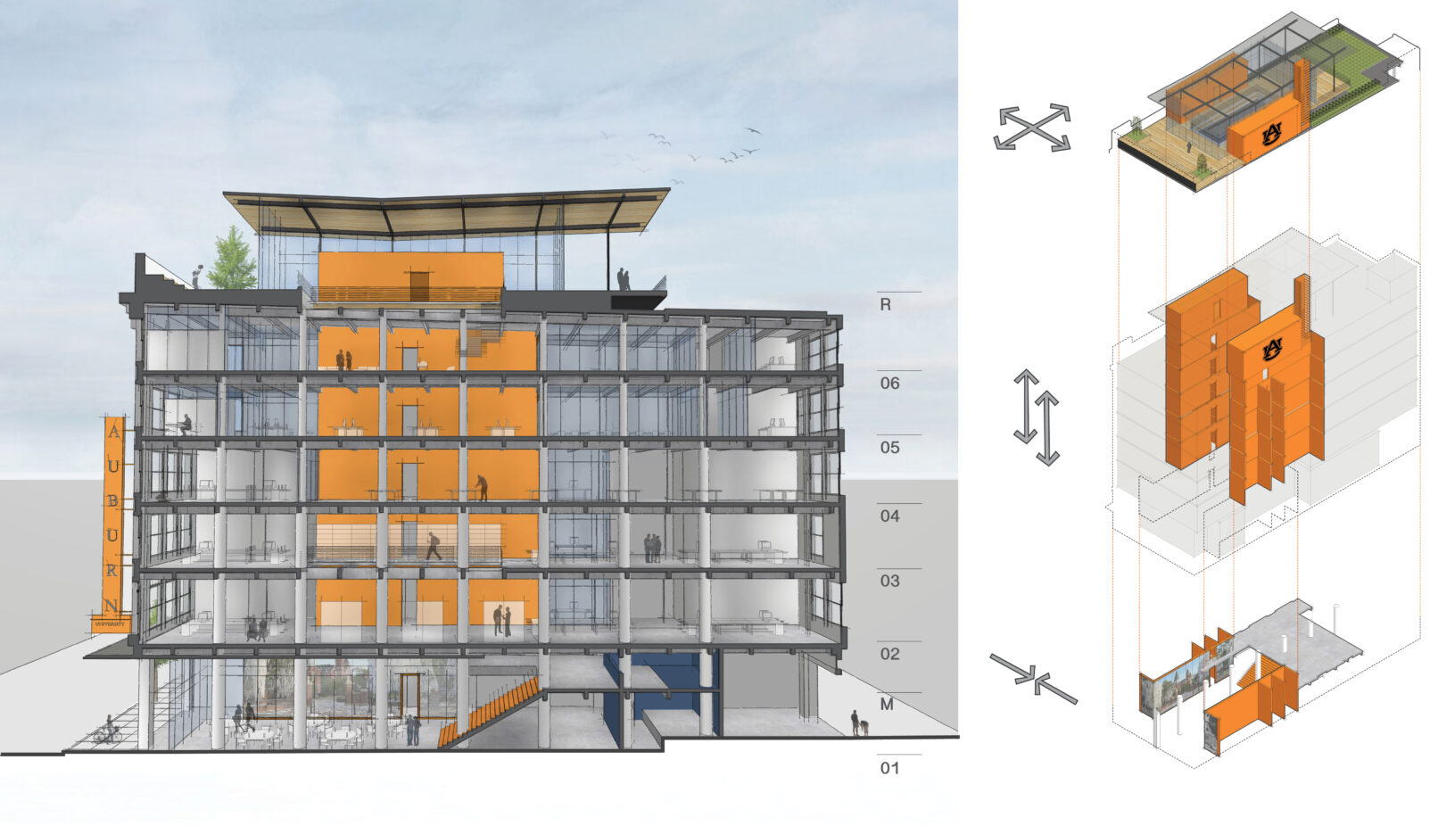 Working with Auburn University, Design Initiative was commissioned to perform a feasibility study and develop a conceptual design for the adaptive re-use of an existing structure in downtown Birmingham for the University’s outreach and support off-campus. The existing seven story structure will be repurposed to provide space for multiple Departments and user-groups, each with specific programmatic and spatial needs.