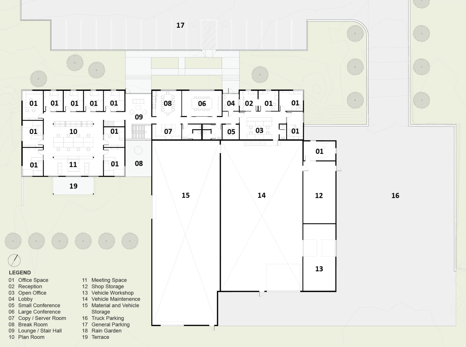 The goals for the project included establishing a design aesthetic that reflected the character of the Owner’s construction company. The character of the front office needed to convey a professional feel with comfortable office space for staff and visitors while the back portion express durability and utility appropriate for use by the field staff and for construction operations.